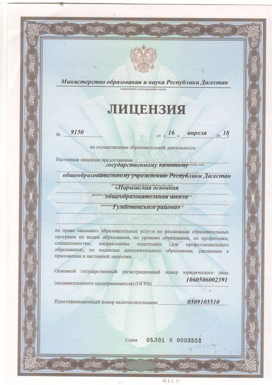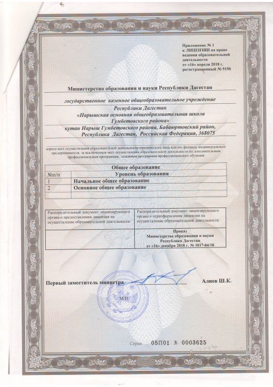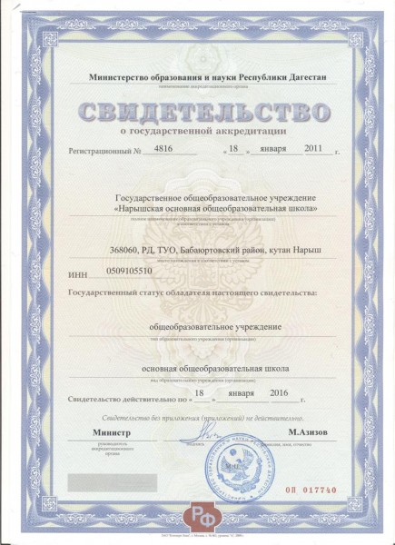 | Полное наименование образовательной организации* | Государственное казенное общеобразовательное учреждение Республики Дагестан "Нарышская основная общеобразовательная школа Гумбетовского района" |